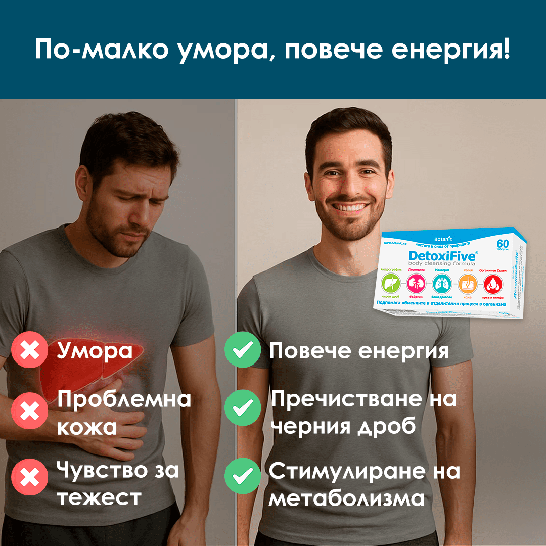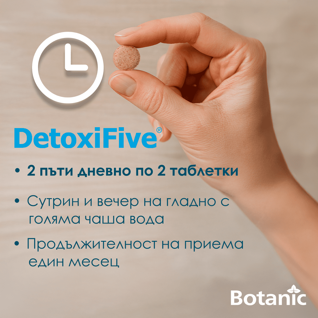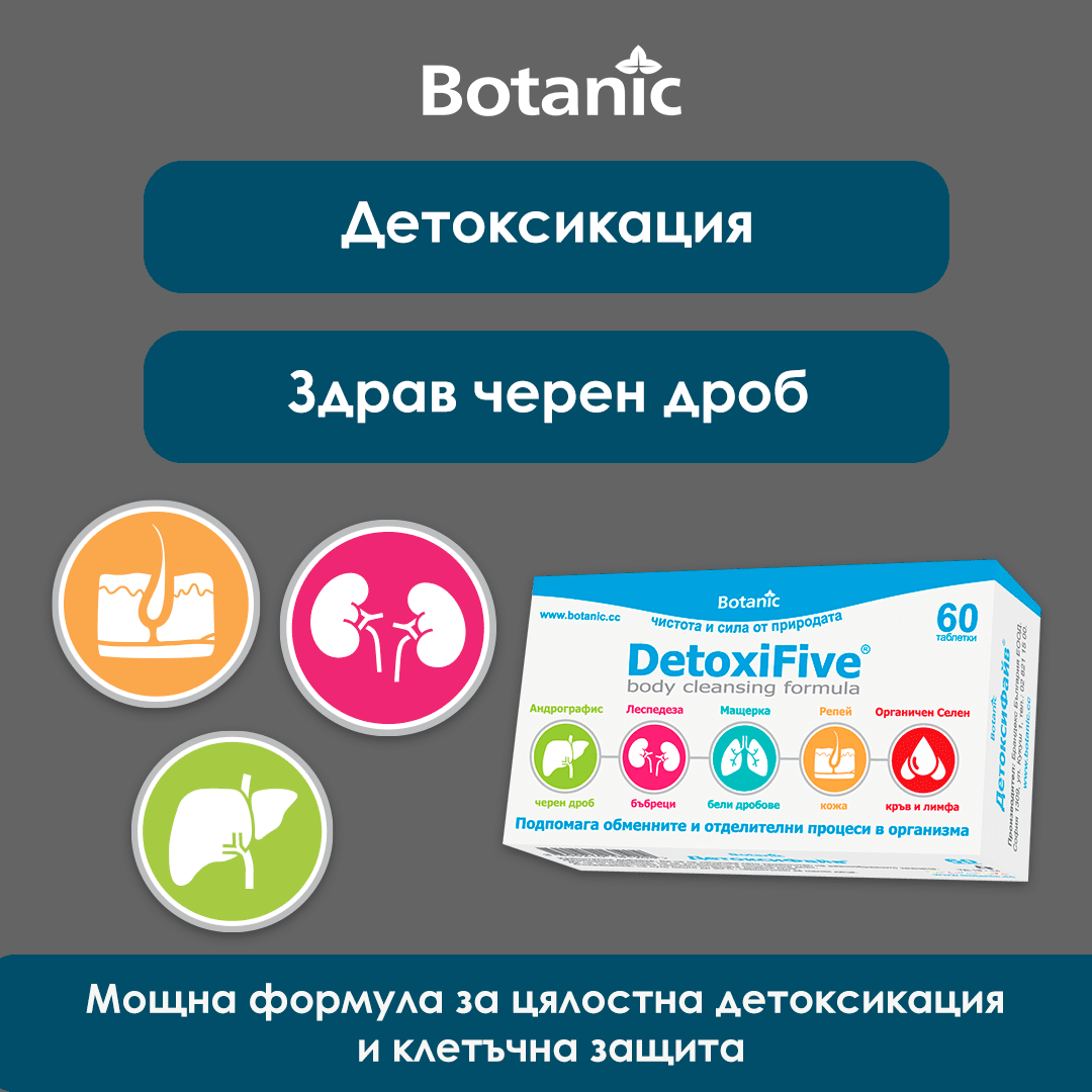 DetoxiFive подпомага елиминирането на токсини от тялото, подкрепя функцията на черния дроб и бъбреците, има антиоксидантен ефект и засилва естествените защитни механизми на организма.