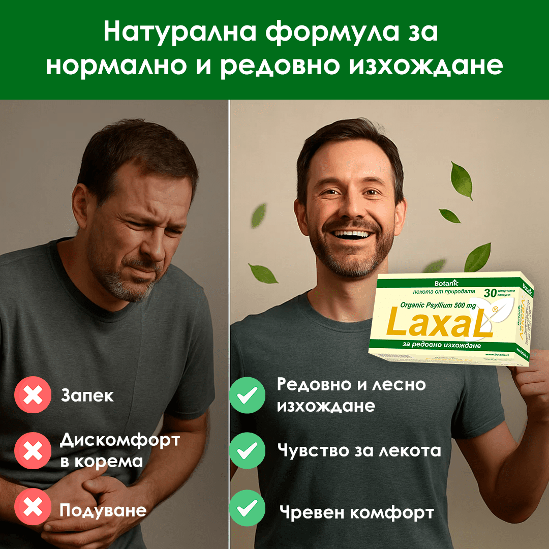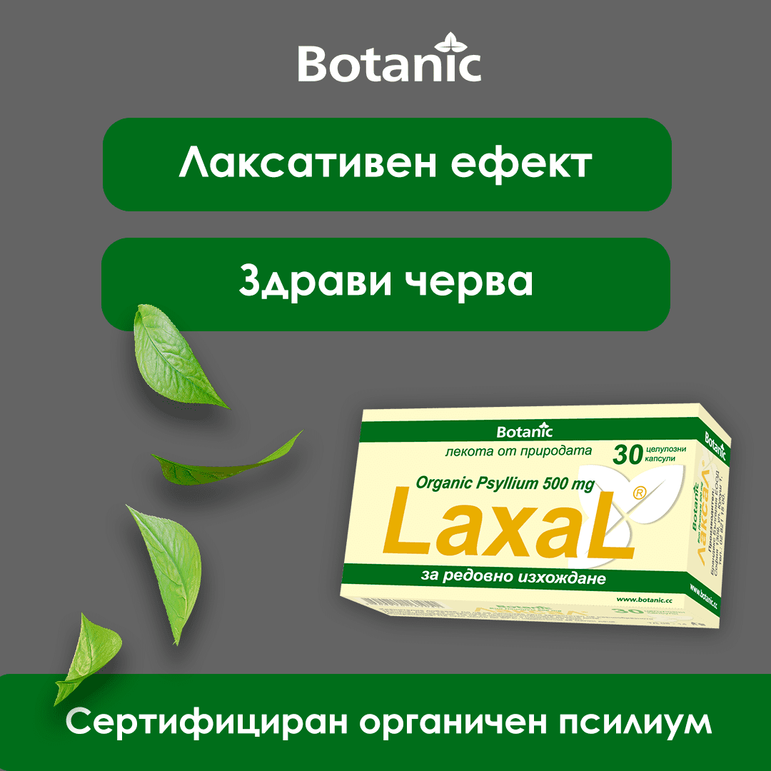 Органичният псилиум в LaxaL абсорбира вода в червата и увеличава обема на фекалните маси, което стимулира естествената перисталтика. Действа механично, без химично раздразване на червата.